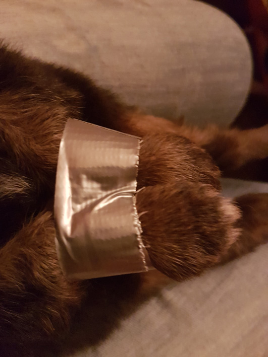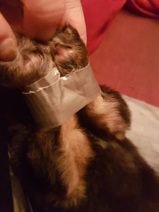 Der korrekte Sitz des Tapebandes muß mehrfach am Tag kontrolliert werden. Da ein Welpe sehr schnell wächst, empfiehlt es sich, das Tape alle 3 Tage zu erneuern, damit es nicht zu eng wird und die Pfötchen abschnürt (vorsichtig abschneiden, entfernen und neu kleben). Dann nimmt man die Beinchen und bewegt sie mehrfach täglich rauf und runter und winkelt sie an und streckt sie leicht (wie in der Physiotherapie) Zusätzlich empfiehlt es sich, hochdosierten Vitamin B-Komplex einzusetzen (am besten den Tierarzt nach Vitamin B-Komplex zur Injektion fragen) . Der Welpe sollte auch mehrfach am Tag bei der Hündin zum Säugen angelegt werden, da die Hündin sich öfters anders in der Wurfkiste hinlegt und der Welpe nicht so schnell krabbeln kann, wie seine Geschwister. Sobald die Welpen beginnen, zu laufen und zu stehen, sollte das Tape entfernt werden. Der Welpe sollte nun wieder so kräftig sein, daß er auf seinen eigenen Beinchen stehen und laufen kann.