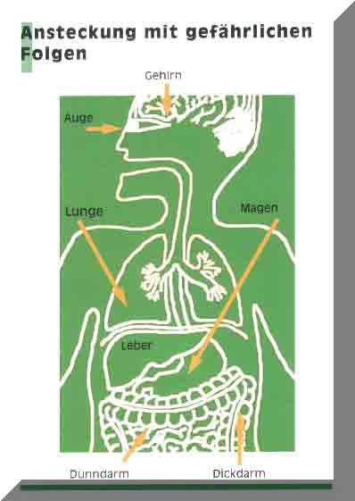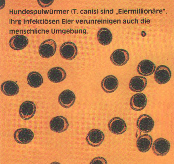 Praktisch alle Hundewelpen und Junghunde und bis zu 32% aller erwachsenen Hunde Sind vom Hundespulwurm Wurm befallen. Verschiedene Untersuchungen machen auf die von den Larven dieses Parasiten ausgehende Gesundheitsgefährdung aufmerksam. So wiesen 249 von 2.864 in einer Klinik untersuchten Serumproben von Menschen Abwehrkörper gegen die Larven des Hundespulwurms auf. Dabei lag die Rate der positiven Reaktionen bei Patienten aus Großstädten mit 1O,5% am höchsten (Köhler G.: Bundesgesundheitsblatt 23. Nr. 1/2 1980). Diese Ergebnisse besagen, dass jede zehnte der untersuchten Personen eine Infektion mit der Larve des Hundespulwurms durchlaufen hat. Der Mensch steckt sich mit der Larve des Spulwurms an, indem er die mikroskopisch kleinen Wurmeier über den Mund aufnimmt. Die Eier können im Fell des Hundes kleben und beim Streicheln des Tieres an die Hände und von dort in den Mund des Menschen gelangen. Besonders gefährdet sind Kinder, die mit Welpen spielen oder sich in Sandkästen infizieren, die häufig mit Hundekot verseucht sind (Köhler C: Bundesgesundheitsblatt 23. Nr. 1/2, 1980).Zum Glück ist nicht jede Infektion, die von den Ärzten als Toxocariasis bezeichnet wird, zwangsläufig mit schweren Gesundheitsschäden verbunden. Wer sich ansteckt, trägt jedoch ein erhöhtes Risiko, dass ernsthafte Gesundheitsschäden auftreten bzw. zurückbleiben können.